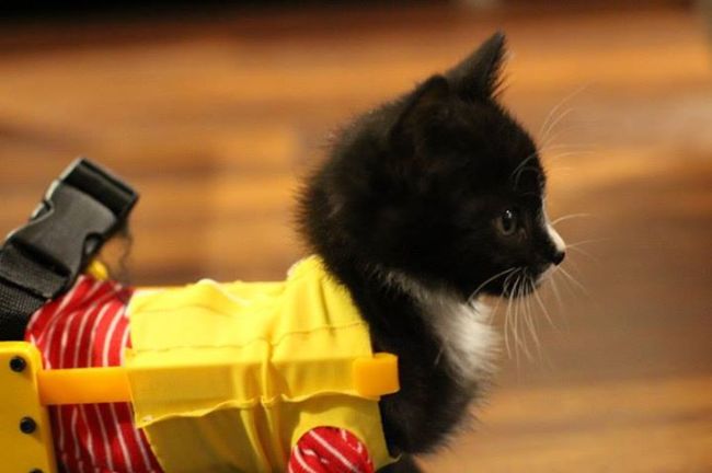 Tiny Tim همراه با خواهر و برادرانش از لیست کشتن از سر ترحم پناهگاه حیوانهای کارولینای جنوبی نجات داده شد و تنها چند روز بعد معلوم شد پاهای عقبی بچه گربه فلج است. Tiny Tim با وجود محدودیت، با سرعت و انرژی به اطراف حرکت میکرد که سبب شد نگهدارندههای آن متوجه شوند شیوهای بهتر برای راه رفتن نیاز دارد و در این فرآیند یک باشگاه هکرها و سازندههای خودآموز به نام Subproto تصمیم گرفت تا یک صندلی چرخدار چاپ سه بعدی برای Tiny Tim بسازد.